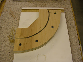 I decided to make a thin molding about 3/16" thick and 3/4" wide to go around the inside of the cockpit and motor well areas to cap the planking boards ends and edges. While simple in concept, it is a bit more involved to fit tight and get around the radiused corners. I made a couple of glue-up jigs to create the molding in the corners. I traced the radius on a piece of plywood, cut it out on the bandsaw, and screwed it down to a scrap board. On the table saw from the planking scraps, I cut about 8" long strips about 0.060" thick, ran hot water over a piece and then formed it into the corner on the boat, taped it in place and let it dry. Then laminated a couple of pieces at a time in the jig using water proof Titebond glue. After a while I had 4 corner moldings that almost fit.